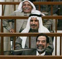 The defendants initially all took their places quietly, in marked contrast to two weeks ago when Saddam Hussein shouted "Down with Bush", and he and his half brother Barzan Ibrahim al-Tikriti continued a stormy exchange with the judge.