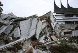 A man stands in front of a collapsed building after an earthquake hit Padang, on Indonesia's Sumatra island September 30, 2009.