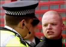 A National Front protestor is removed by police during a demonstration outside Finsbury Park station, London, which began at North London Central Mosque, April 9, 2004. (REUTERS/Matt Dunham)