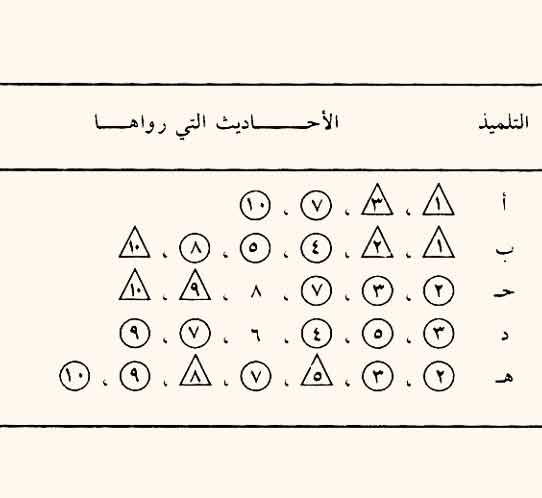 ولتقريب هـذا الأمر نمثل له بمثال رياضي؛ لأن علم الحديث قريب من العلوم الرياضية. لنفرض أن الشيخ حدث بعشرة أحاديث، وكان له خمسة من التلاميذ، وأن التلاميذ تفاوتوا في سماع هـذه الأحاديث، فبعضهم روى أكثر من غيره. وكان ذلك على النحو التالي: [ ص: 94 ]