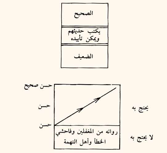 وأما الإمام الترمذي فقد توجه إلى فئة من الرجال ليسوا بالمتروكين ولا الكذابين ولا فاحشي الخطأ، ولكنهم من أهل الصدق والستر وتعاطي العلم، وبعضهم لا يعتمد عليه لو انفرد في حديث، ولكنهم يصلحون للاحتجاج إذا وجدوا من يؤيدهم ويعضدهم؛ وبذلك يكون الترمذي قد فتح الباب لتدارك ما لم يتداركه غيره، فقد كان المنهج قبل الترمذي يقوم على تقسيم الحديث إلى مستويين صحيح وضعيف. والصحيح مقبول والضعيف مردود كما في الشكل (أ) .