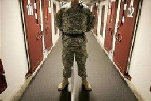 A U.S. Army guard stands in a corridor of cells in Camp Five, a facility at the Guantanamo Bay Naval Station in Guantanamo Bay, Cuba September 4, 2007.
