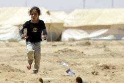 A Syrian refugee runs past tents in the Zaatari refugee camp, located outside the northern Jordanian city of Mafraq, near the border with Syria, on August 15, 2012.