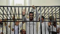 Supporters of Egypt's ousted President Mohammed Morsi raise the four-finger sign, a symbol of defiance associated with the supporters, during a trial in court in Alexandria, Egypt, Saturday, March 29, 2014.